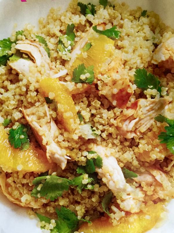 5. Smíchejte kousky kuřecího masa s wuinoou a zbývajícími ingrediencemi. Hotový salát skaldujte v lednici.